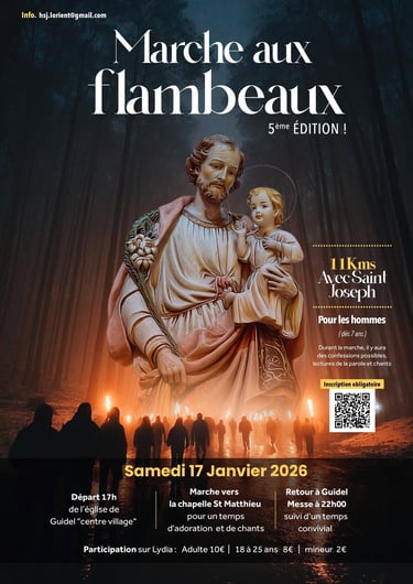 Pélérinage aux flambeaux Saint Joseph (pour les pères de famille), samedi 17 de 17h00 à minuit.